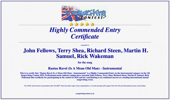 The 1970 'Rastus Ravel (Is A Mean Old Man) Instrumental' was a 5-★★★★★ Highly Commended Entry in the 2025 UK Songwriting Contest.